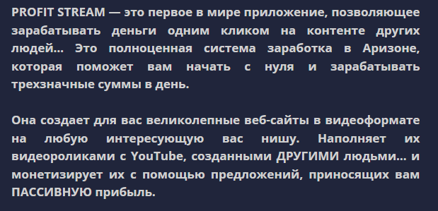 Согласно информации на сайте, инвестор мог пожизненно получать ежедневные выплаты в $40 за просмотр пользователями видеоконтента на его сайте. При этом мошенники с платформы Profitstream обещали создать данный ресурс «под ключ» и наполнить его чужими видеороликами с Youtube. Таким образом, клиенту вообще ничего не нужно было делать, чтобы начать получать деньги. Подобная «простота схемы» — верный признак скама.
