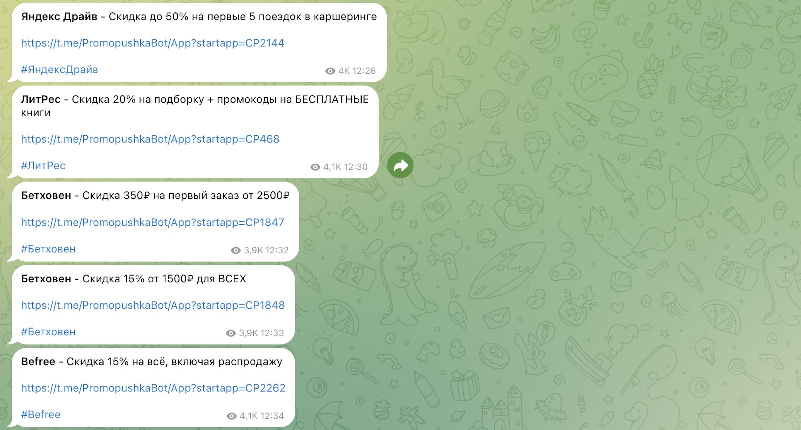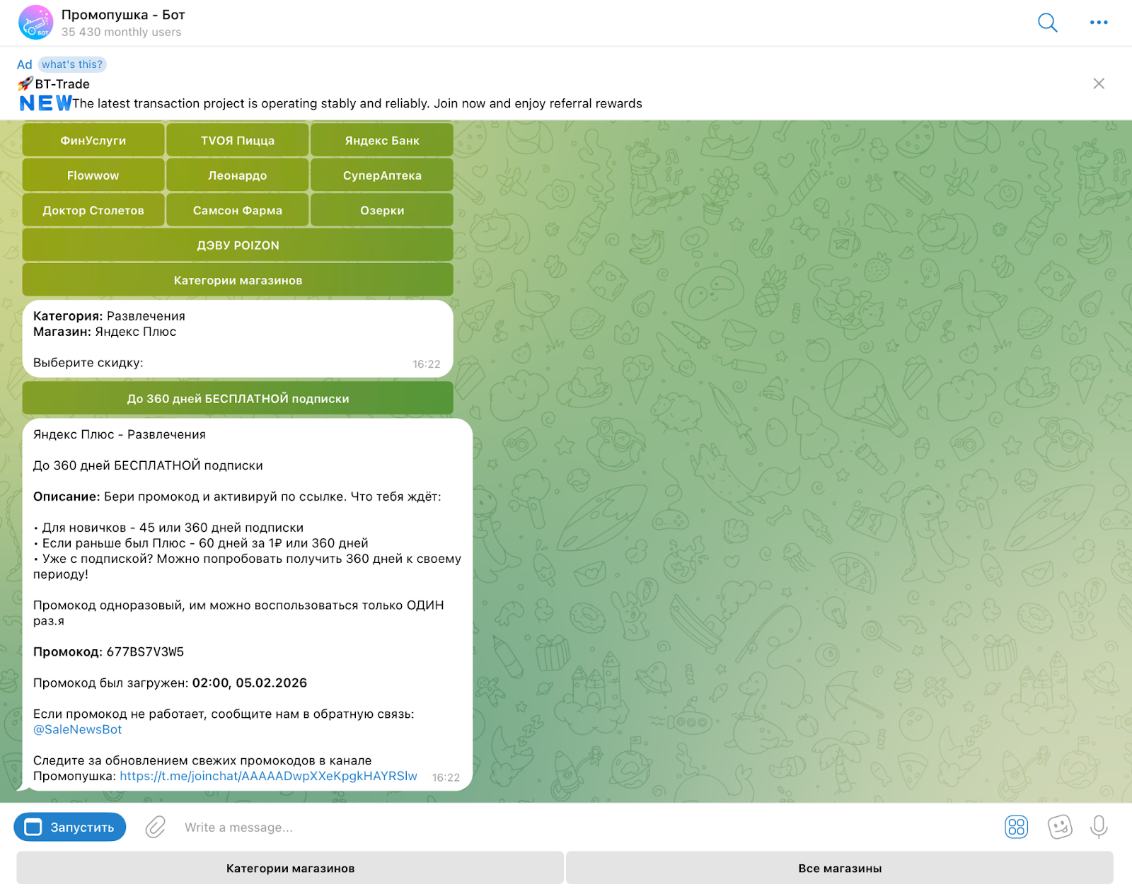 Сервис работает в Телеграмм и позиционируется как бесплатный каталог актуальных промокодов, купонов, партнерских ссылок и тестовых подписок. Рассылка приходит автоматически: бот сбрасывает сообщение с акцией, таймером и прямой кнопкой перехода на сайт партнера. Команда авторов заявляет, что проверяет каждое предложение, хотя подтверждений нет.