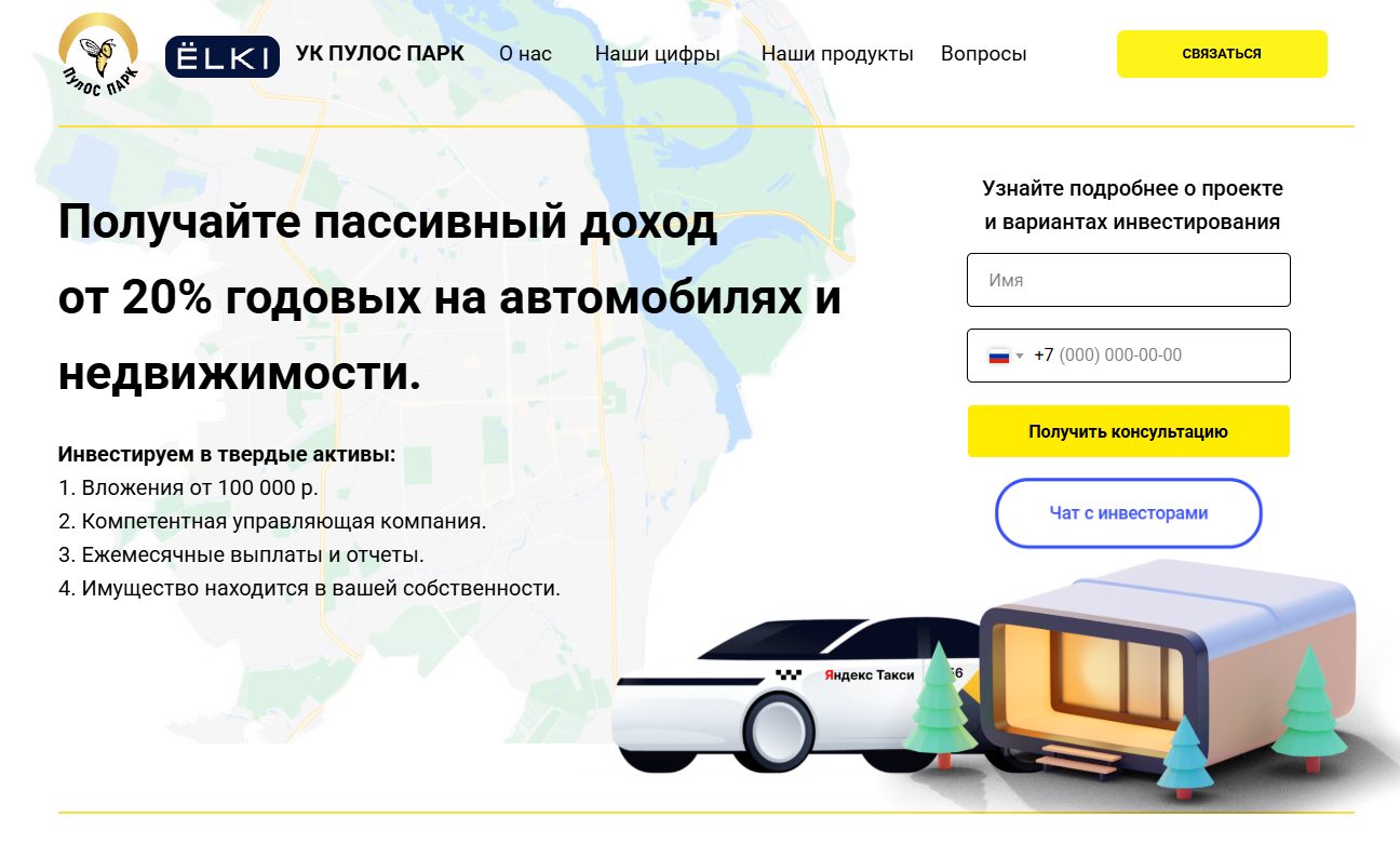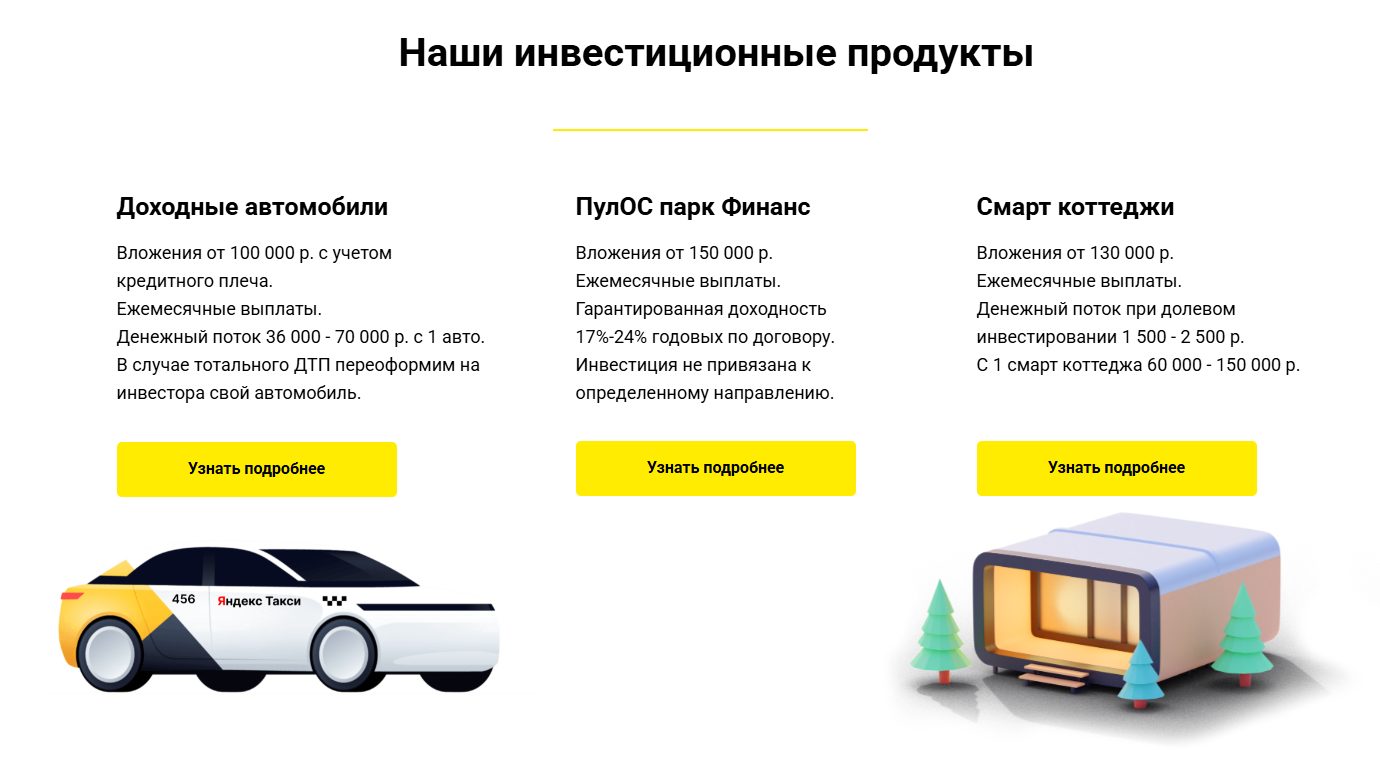 Также в отзывах инвесторов о «Пулос Парк Такси» упоминается о возможности обеспечить доход за счет недвижимости, но об этом на сайте меньше информации.