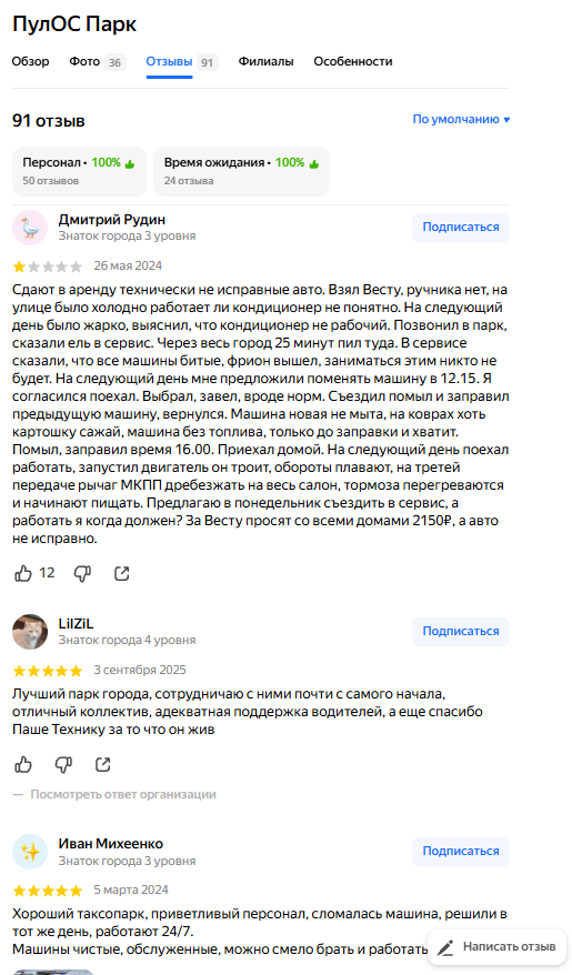 Утверждается, что многие единицы грязные и технически неисправны, что влияет на заработок водителя такси и требует времени на ремонт. Подобное может повлиять на окупаемость инвестиций, но таких комментариев меньше, поэтому можно судить о положительной репутации проекта.