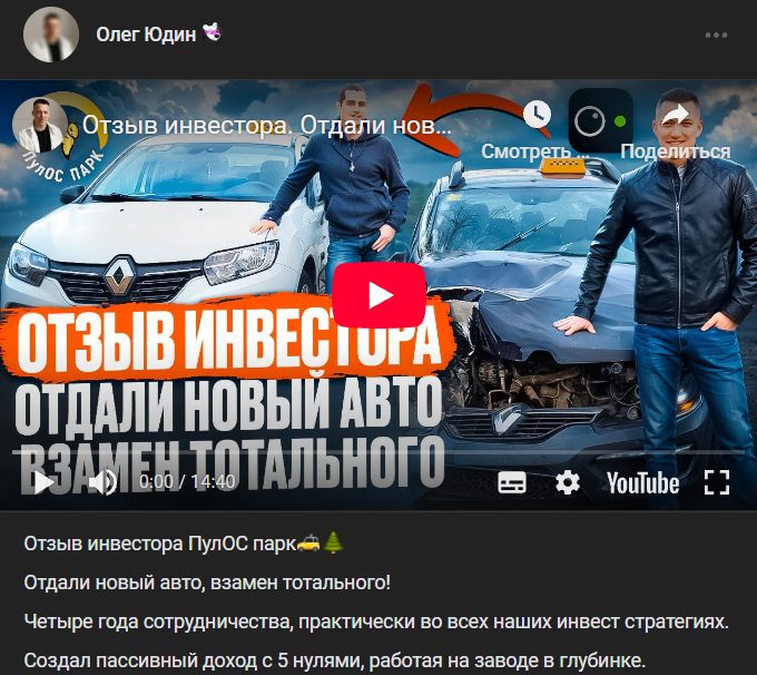 Олег в своих социальных сетях публикует отзывы инвесторов о «Пулос Парк Такси» в виде полноценных интервью, которые могут быть достаточно информативны. Однако нужно понимать, что предприниматель в таком случае может отслеживать, что говорят в ролике и оставлять только положительные комментарии, поэтому такие записи не объективны.