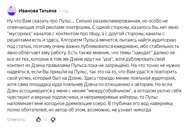 На просторах интернета встречаются смешанные отзывы о Пульс Mail Ru. Часть пользователей отмечает возможность заработка на публикации материалов, но при этом указывают на сложность удержания аудитории и необходимость регулярной работы с контентом. Также есть упоминания о задержках с начислениями и строгих правилах модерации, которые необходимо учитывать при публикации.