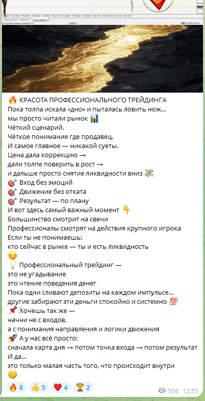 Контент канала Пути к Трейдингу построен вокруг демонстрации успешных сделок и описаний движения рынка. Автор регулярно публикует посты о прибыльных сигналах, утверждая, что подписчики зарабатывают благодаря пониманию логики рынка.