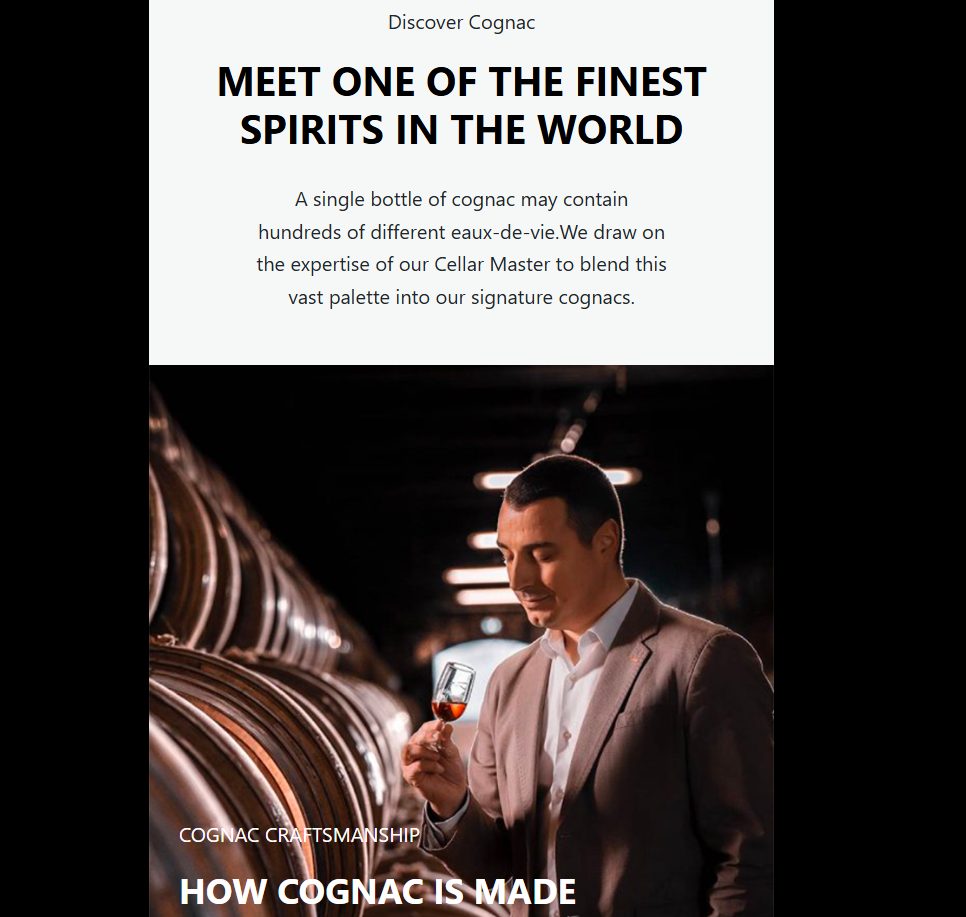 На главной странице фотографии бокалов, коньяка, бочек, тексты про культуру напитка, процесс производства, сочетание с едой и правильную подачу. Все это создает ощущение, что перед пользователем информационный или промо-ресурс про алкоголь, а не финансовый проект.