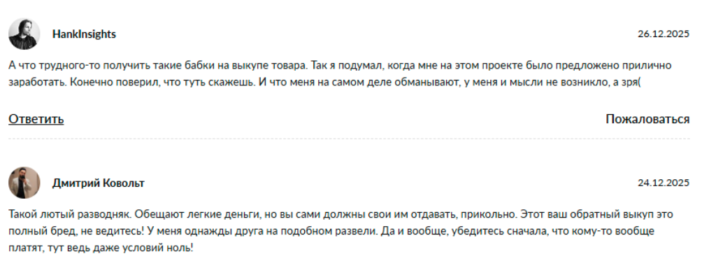 После входа пользователю начинают предлагать заработок на обратном выкупе товаров. Нужно внести деньги, выкупить товар, выполнить задание, оставить комментарий или пройти этап, после чего якобы начисляется прибыль. Сначала суммы небольшие, иногда даже дают вывести минимальный доход.