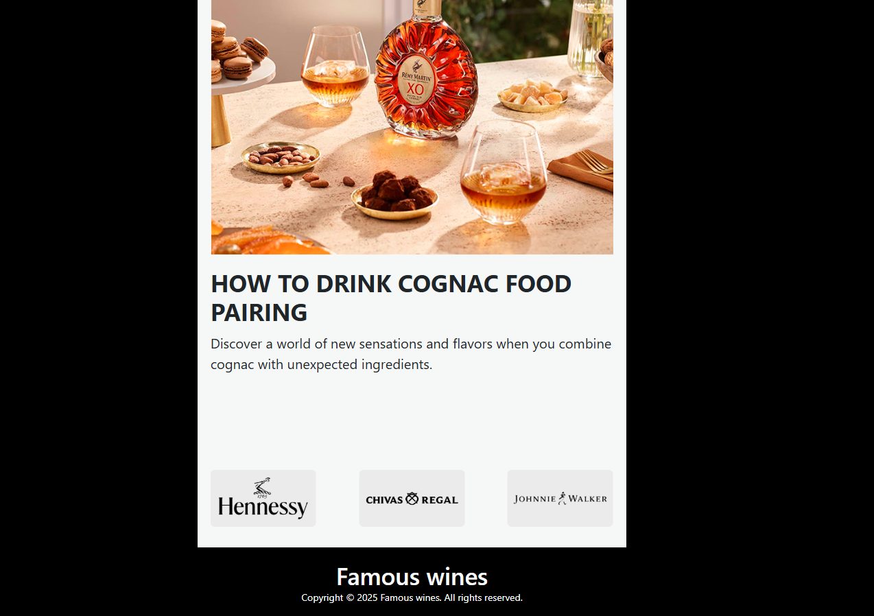 В подвале сайта указано название Famous wines и копирайт 2025 г., но на этом все заканчивается. Ни юридического лица, ни страны регистрации, ни лицензий, ни контактов, ни даже электронной почты на сайте нет.