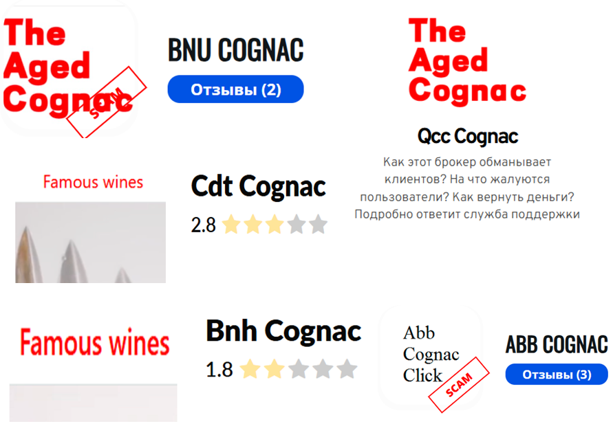 В обзорах и отзывах встречаются Cdt Cognac, Abb Cognac, Bnh Cognac, Bnu Cognac, cde cognac, bnb cognac click, top tgp click и другие вариации. Это уже не случайность, а явный признак сетевой схемы с клонами.
