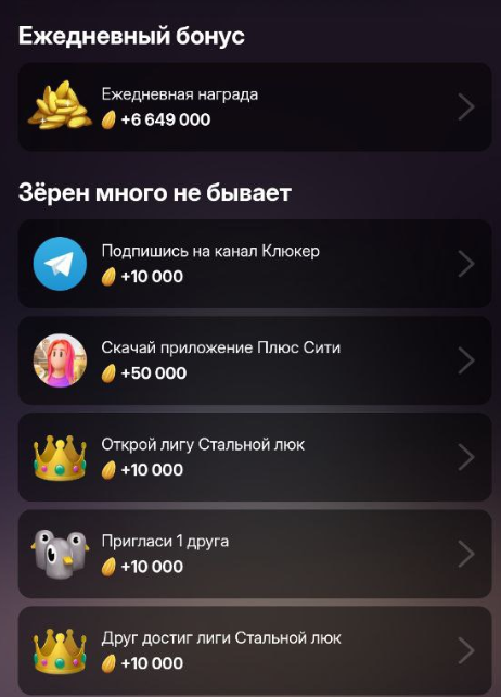 Задания в игре ориентированы на другие проекты Яндекса. Никакой рекламы сервисов или сомнительных сайтов. Вознаграждение — от 5 000 до 50 000 зерен. Простые задания отлично помогают стартовать в Клюкере. Например, подписаться на Телеграмм-канал стоит 10 000, которые можно превратить в 1 000 пассивного дохода.