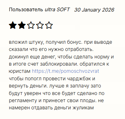 Негативные комментарии в основном касаются внезапной блокировки счетов сразу после попытки вывода средств. Пользователи рассказывают о странных требованиях сначала отработать полученный бонус. После дополнительного пополнения баланса аккаунт просто блокируют без объяснений. Некоторые пострадавшие обращаются к юристам для возврата своих денег через процедуру чарджбэка.