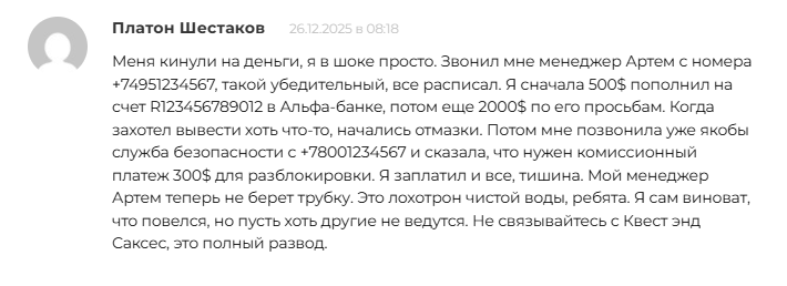 Отзывы об quest and success online в сети крайне негативные. Люди открыто пишут о риске потерять все деньги. Никто не смог вывести заработанную прибыль со счета.
