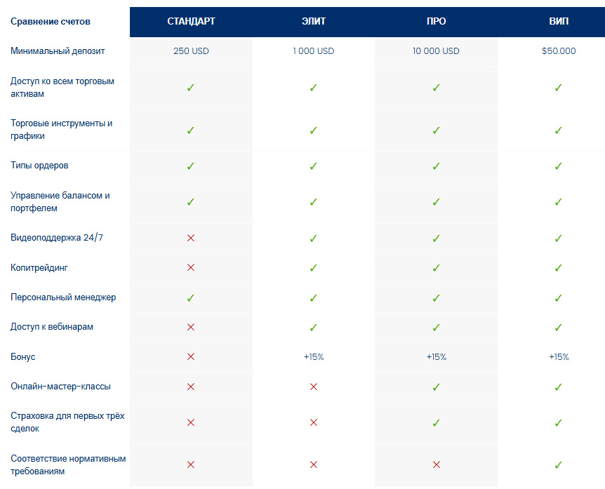 Все тарифы дают доступ к торговым активам и базовым функциям. Различия начинаются в дополнительных опциях и сервисе. Видеоподдержка круглосуточно только начиная с тарифа Элит. Копитрейдинг и персональный менеджер – тоже не для всех.