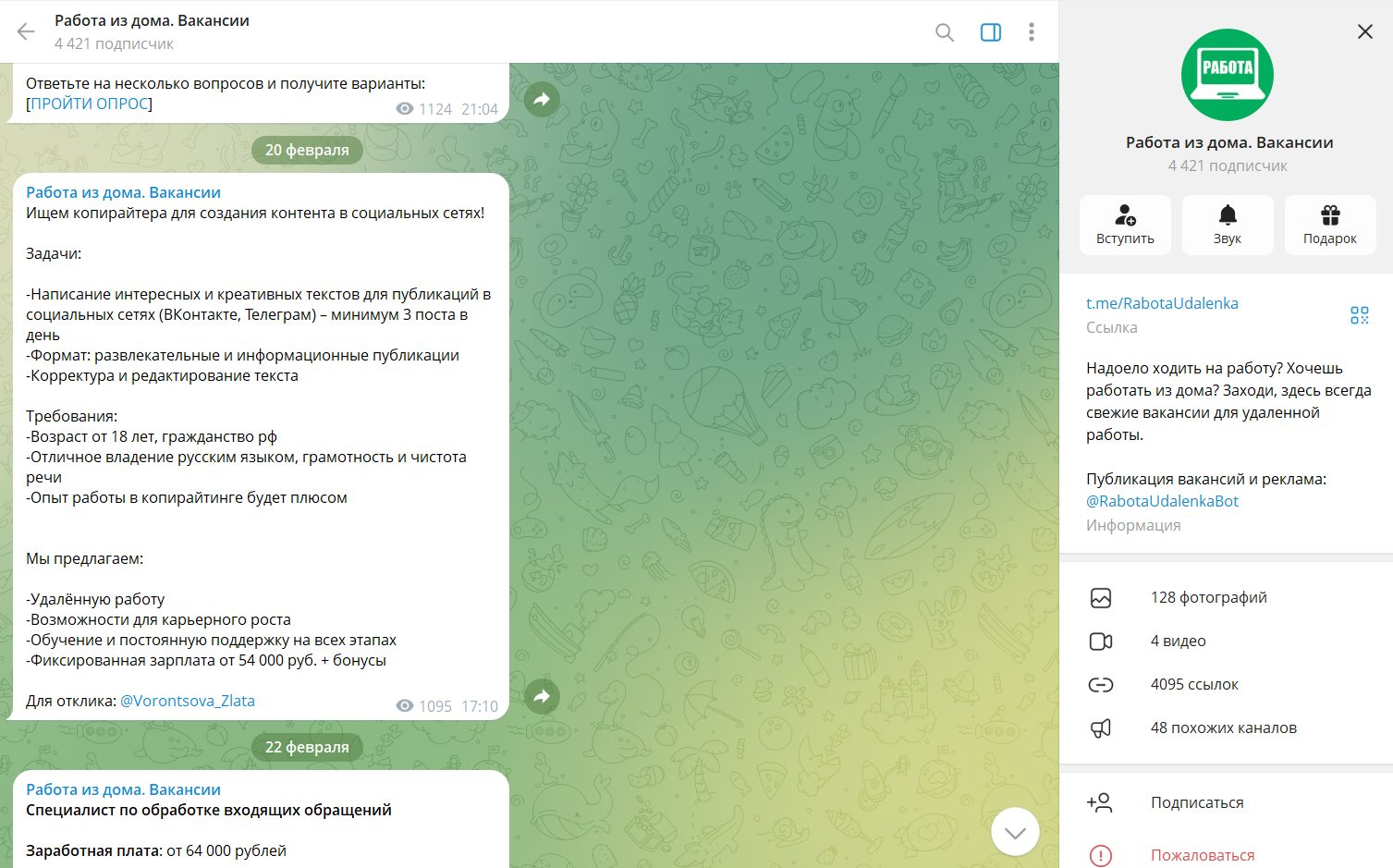В ленте канала действительно каждый день публикуются вакансии по различным направлениям онлайн-работы. Наиболее популярными являются предложения для копирайтеров, а также вакансии на обзвон базы клиентов из дома. В каждой публикации есть краткое описание обязанностей, графика и условий оплаты. Заработная плата указана не везде. Для получения дополнительной информации и отклика по вакансии необходимо связаться с контактом, указанным в объявлении.