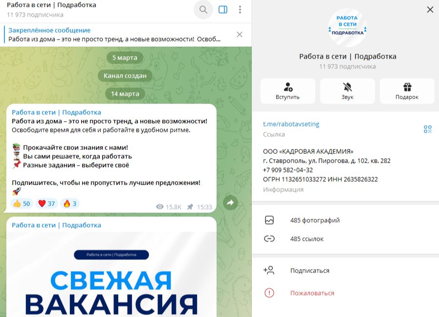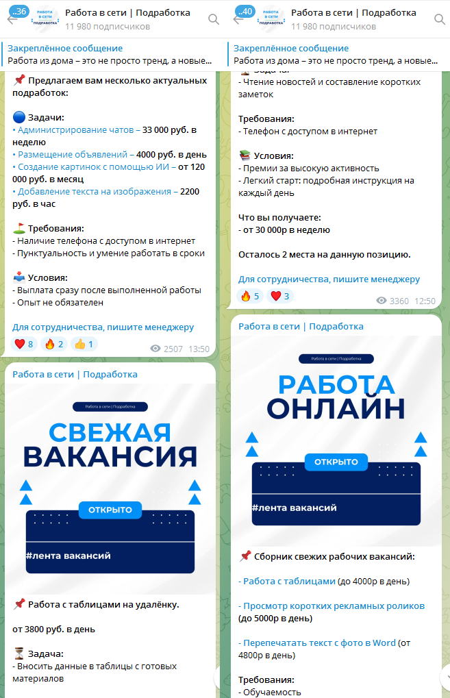 Телеграм-канал «Работа в сети Подработка» был запущен в марте 2025 году. Это вновь подтверждает небольшой возраст конторы. Сейчас на блог подписано почти 12 тысяч участников. Здесь тоже нет подробностей о фирме, контактов менеджеров и приветственного сообщения.