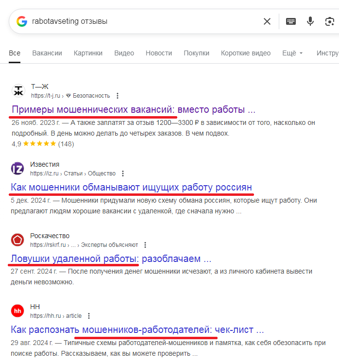В интернете о проекте Rabotavseting Clients Site нет никаких упоминаний и отзывов, что говорит о его невостребованности. Также это означает, что источник точно работает не 5 лет. Стоит заметить, что при поиске информации о сервисе, высветилось множество статей о том, что подобные ресурсы с вакансиями являются мошенническими ловушками.