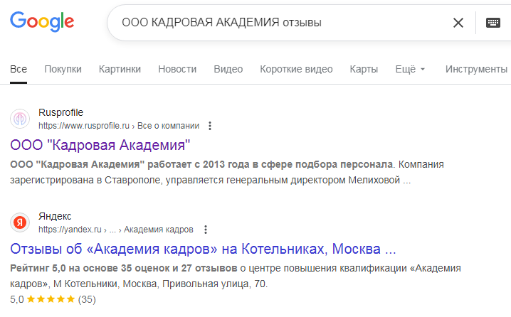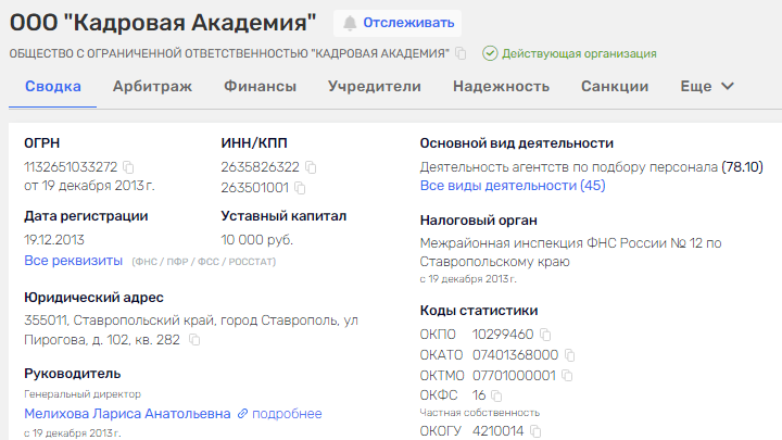 В описании паблика указываются юридические данные компании ООО «Кадровая Академия». Она была зарегистрирована в 2013 года с основным видом деятельности, который позволяет заниматься подбором персонала, что вполне подходит фактической работе.