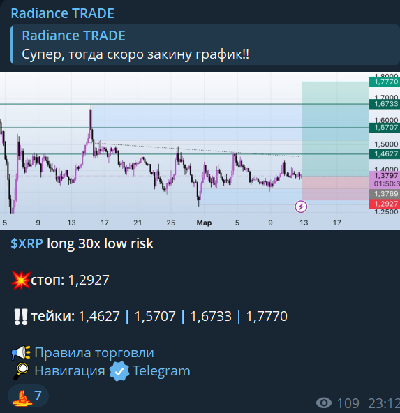 ТГ-канал Radiance Trade не замечен в мошенничестве. Платные услуги не рекламирует, а делится бесплатными торговыми сигналами. Единственный источник монетизации – реферальное вознаграждение от криптобиржи Weex.