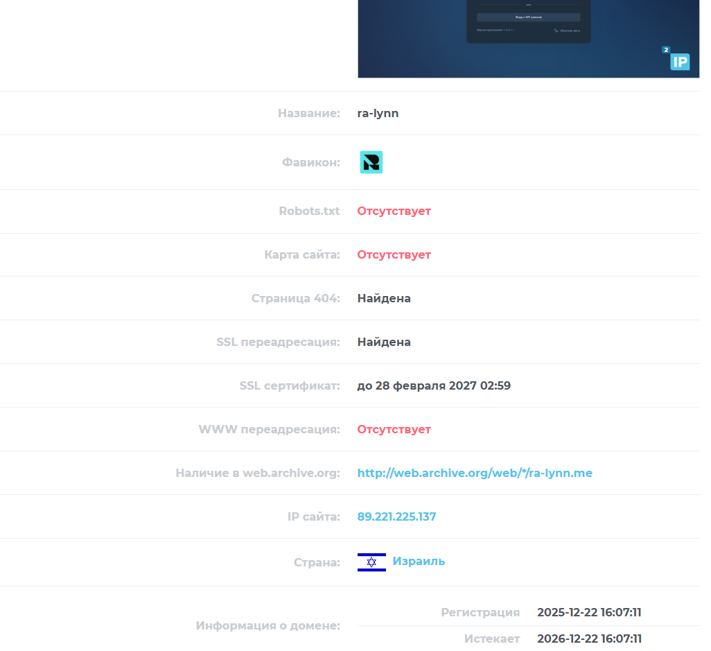 У фирмы 2 домена: Ra lynn me и Raelynn xyz. Первый зарегистрирован в 2025 году, что, скорее всего, совпадает с датой создания площадки, второй – в 2020 года, хотя это ни о чем не говорит. Мошенники часто покупают уже существующие доменные имена, чтобы казаться старше и опытнее. Но при этом с легендой компании, история которой якобы берет начало в 2017 году, ни один срок не совпадает.