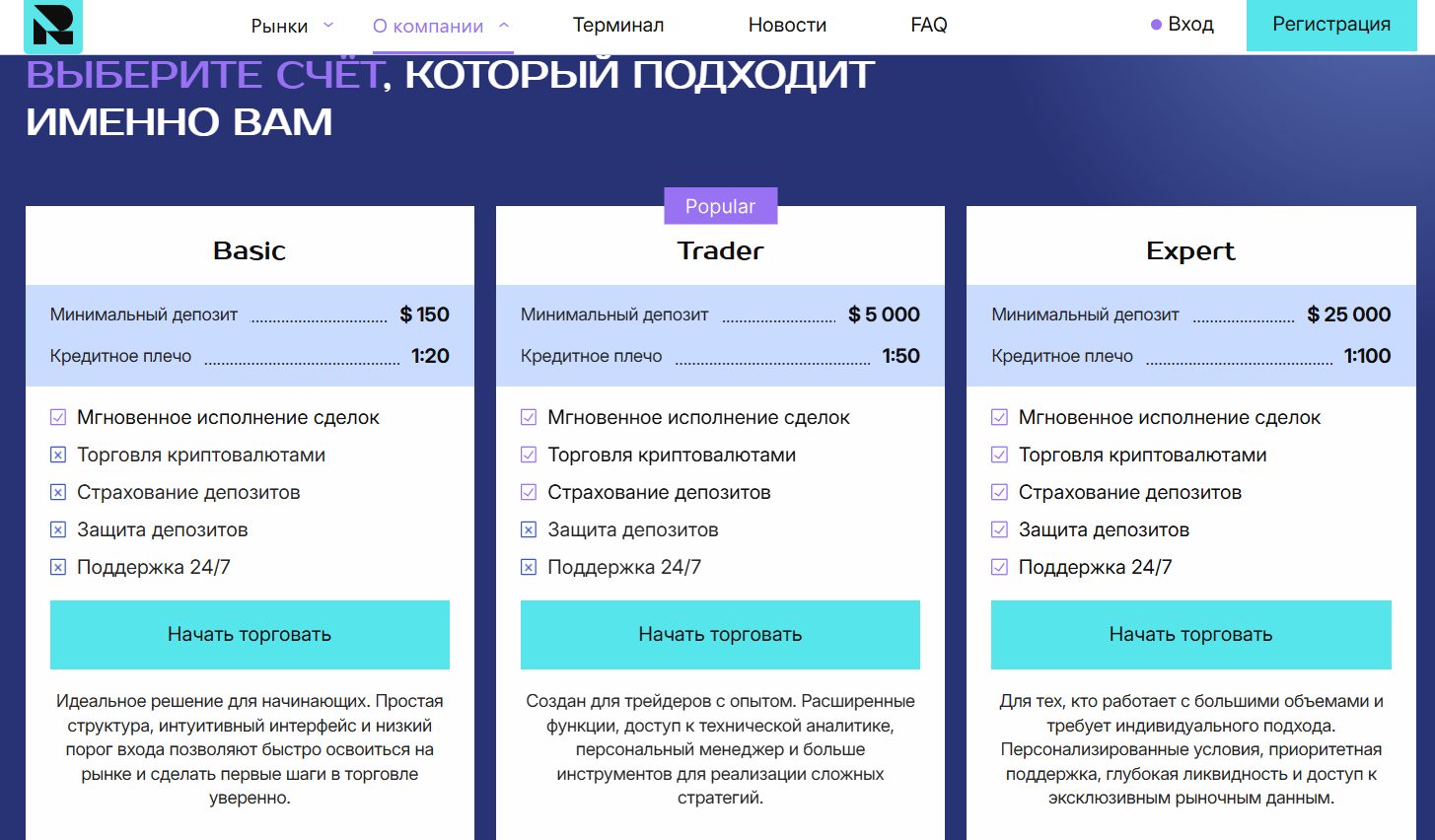 Компания предлагает 3 тарифных плана для любого уровня подготовки: Basic, Trader и Expert. Вход – от 150 долларов, клиенты получают помощь со стороны службы поддержки круглосуточно и страховку депозитов вне зависимости от выбранных вариантов. Правда, согласно отзывам о Https raelynn xyz, есть скрытые условия, например, комиссии при выводе.