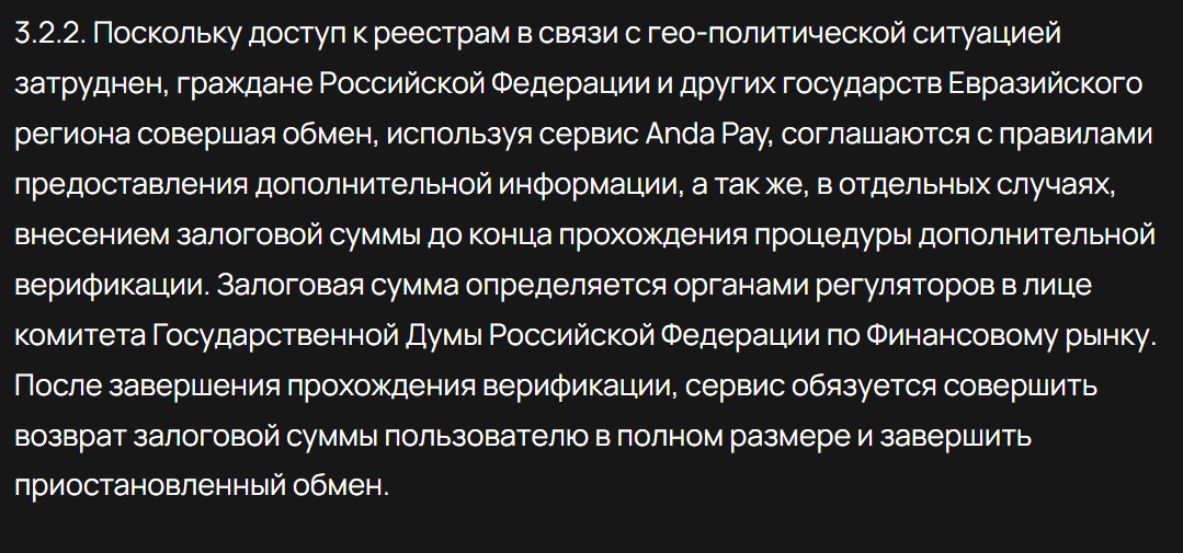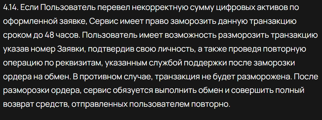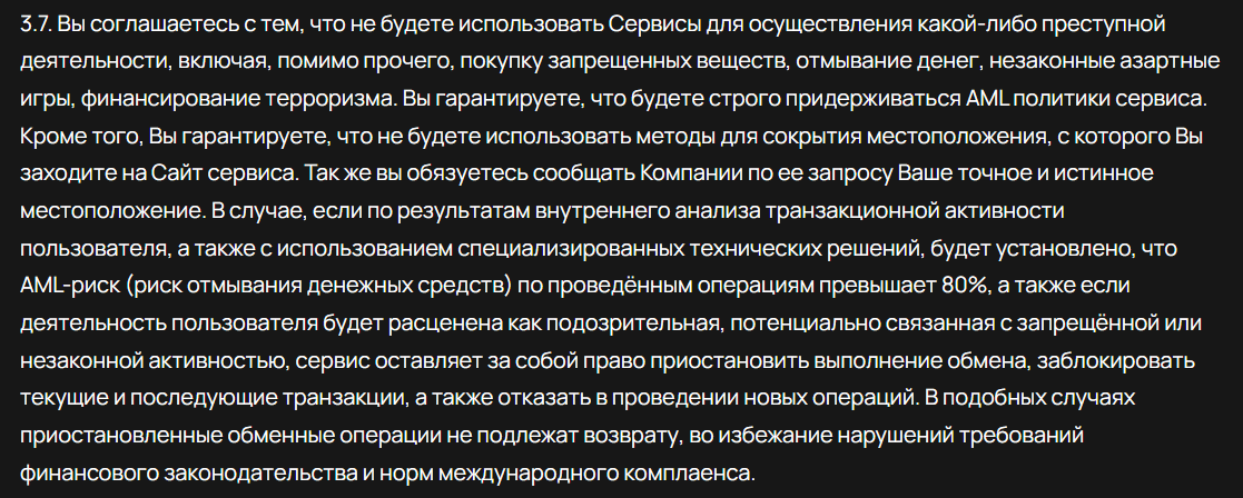В соглашении множество пунктов о заморозке средств. При малейшем подозрении операция останавливается. Могут потребовать видеоверификацию, документы, залоговую сумму. Граждане России автоматически под усиленным контролем из-за «геополитической ситуации». Но это полный бред. Надежные обменники так не работают.