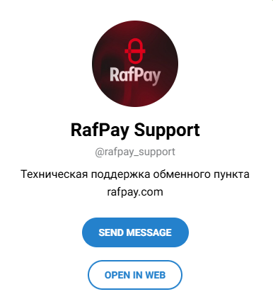 Контакты только Телеграм – rafpay support. Работает 10:00–22:00 по МСК. Юридического адреса нет. Телефона компании тоже. Для финансового сервиса подозрительно. Упоминается реферальная программа. Приглашай друзей и зарабатывай. Детали не раскрываются.