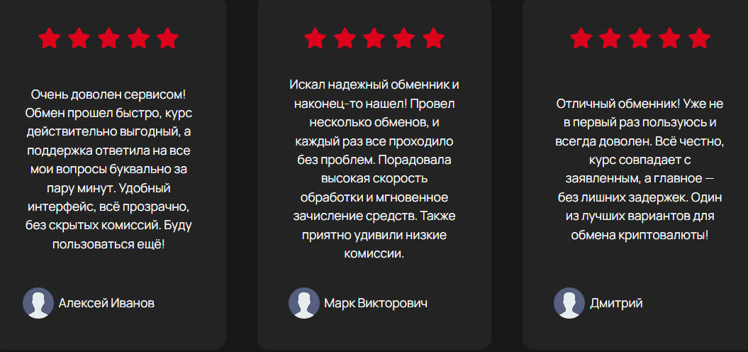 В сети отзывов о Rafpay нет. Ни на площадках, ни на форумах, ни в соцсетях. Месяц работы и полное отсутствие упоминаний. На сайте три восторженных комментария. Все хвалят быстрый обмен и выгодные курсы. Отзывы короткие, общие, без конкретики. Проверить невозможно. Скорее всего заказной контент.