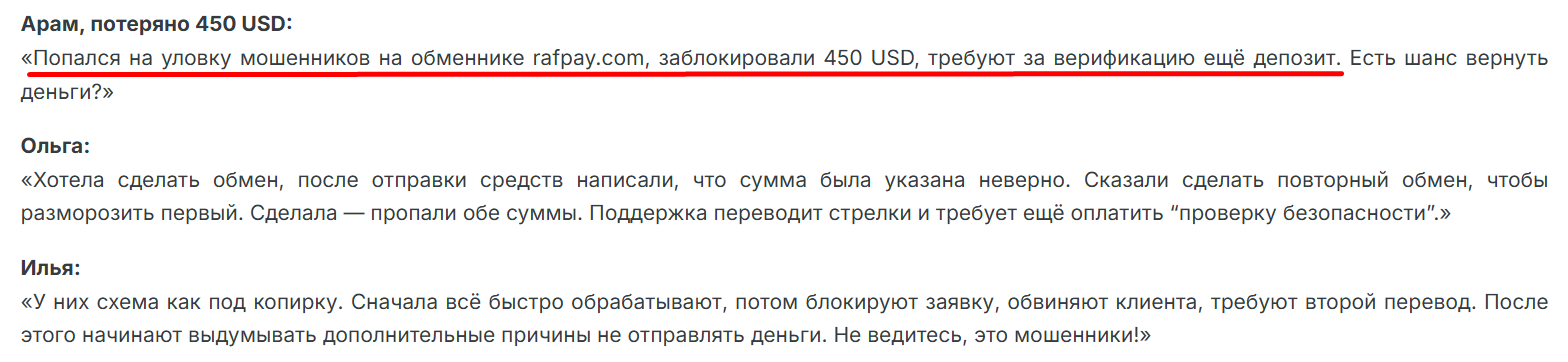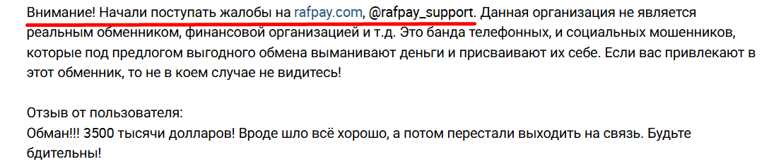Сайты валютников множатся для массового обмана, а на просторах Телеграмма и в других социальных сетях фейковые арбитражники заманивают на данные площадки. Пользователь не концентрирует внимание на проверке биржи Rafpay com, так как обменник дается ведущим Telegram-канала в поэтапной цепочке действий. Обычно инвестор осознает, что попал в финансовую ловушку, когда отправленные через обменник деньги бесследно пропадают.