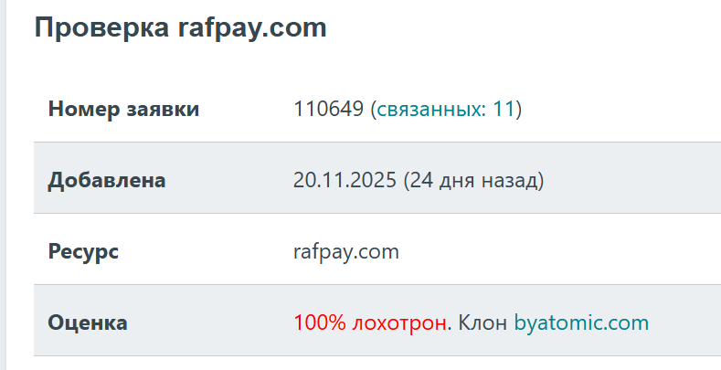 Сайт Rafpay com в качестве обменника начал свою работу в ноябре 2025 года. Данные веб-архива показывают, что данный ресурс использовался раннее другими проектами. Вплоть до апреля 2025 года здесь предлагали услуги по доставке товаров.