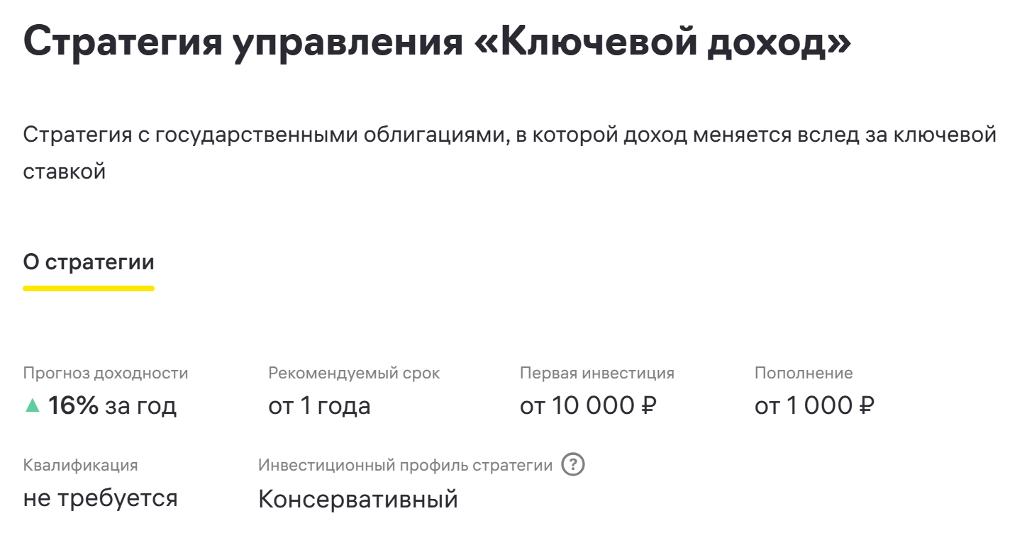 • консервативная стратегия обещает не более 16% годовых, при этом делается упор на ключевую ставку и повышение дохода, если ЦБ решит ее повысить, однако на деле сумма дохода клиентов не меняется;