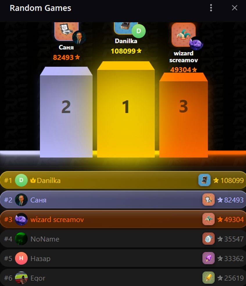 Random Games Телеграм – мини-приложение для мессенджера. Это своеобразный агрегатор игр, который предлагает удобный выбор и моментальный запуск развлечений на любой вкус. Отдельно переходить на сторонние боты или сайты не требуется, регистрация аккаунтов не нужна. Все сессии начинаются сразу при переходе в определенную категорию. Выбор игры происходит рандомно.