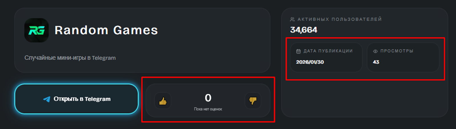 На внешних ресурсах отзывов о боте Random Games ТГ нет. Активных пользователей – примерно 34,6 тысяч человек, но комментарии отсутствуют. В магазинах и на специализированных сайтах с играми для Телеграмм отзывы о проекте не опубликованы, рейтинг не указан.