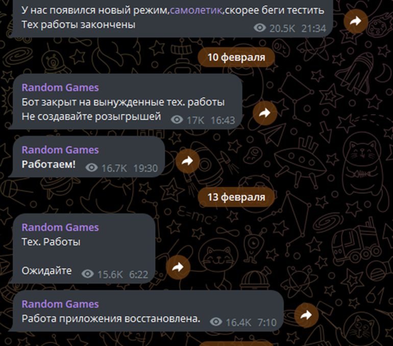 На официальном канале Рандом Геймс в ТГ возможность комментирования постов закрыта. Сообщения могут оставлять только представители администрации. Реакции пользователей скрыты, отдельный чат для игроков не предусмотрен.