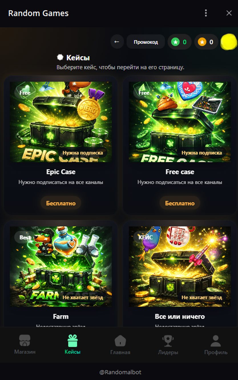 После перехода в мини-приложение открывается страница с бесплатными и платными играми. В первом случае для гейминга нужна предварительная подписка на все каналы проекта. Только после этого можно открыть раздел и начать играть. Платные кейсы требуют оплаты в ТГ звездах. Стоимость – от 10 TGStars.