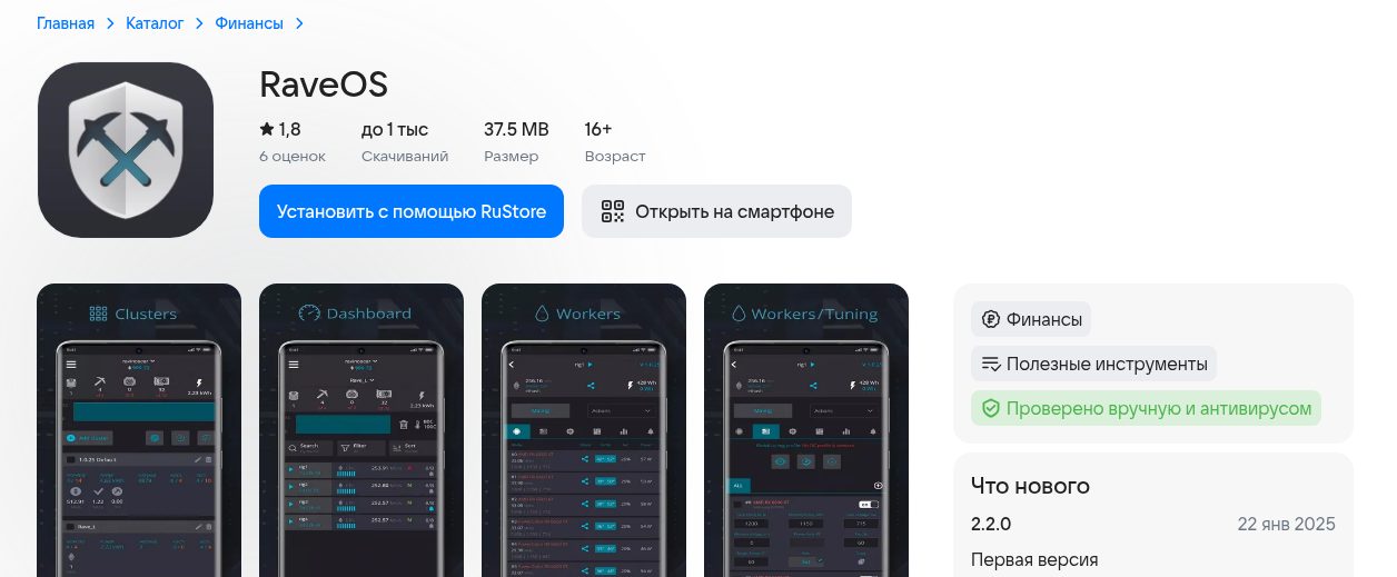 Мобильное приложение RaveOS можно скачать с Rustore. Там у него менее 1 тысячи скачиваний и оценка 1.8 из 5.