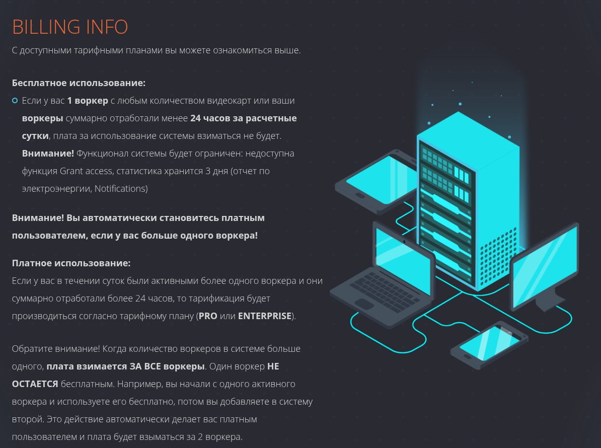 В тарифе PRO можно иметь от 2 до 100 воркеров, цена за каждого — 1.5$/месяц. Статистика хранится уже 30 дней, есть Grant access. Самый дорогой тариф — ENTERPRISE — от 100 воркеров, специальный прайс, отдельный менеджер и дополнительные возможности в плане кастомизации, конфигурации, интеграции и т.п.