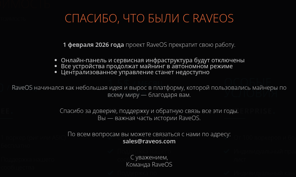 Нет, Rave OS больше работает. P Домен сайта raveos com зарегистрирован в 2019 году. Именно с этого года проект успешно работал до 1 февраля 2026-го. В тот день разработчикам пришлось его закрыть. Причины не указаны.