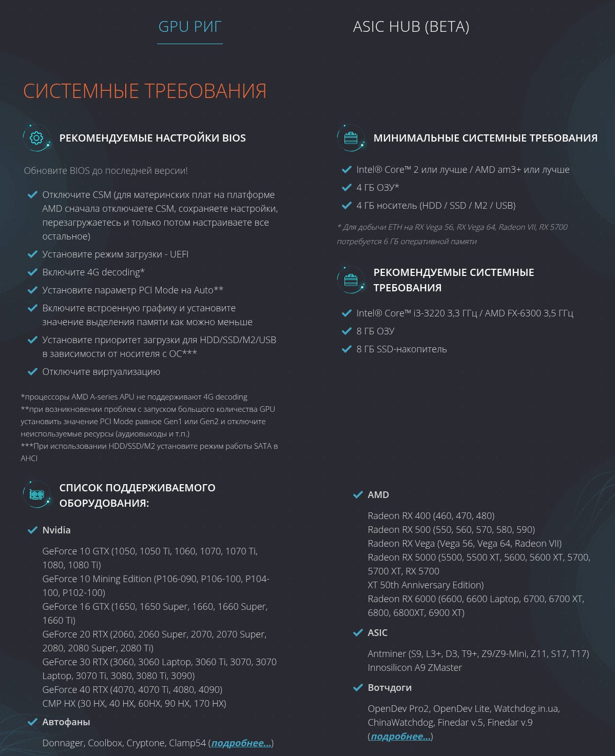 - Майнеры обновляются быстро, есть поддержка как классических, так и новых монет от команды проекта.