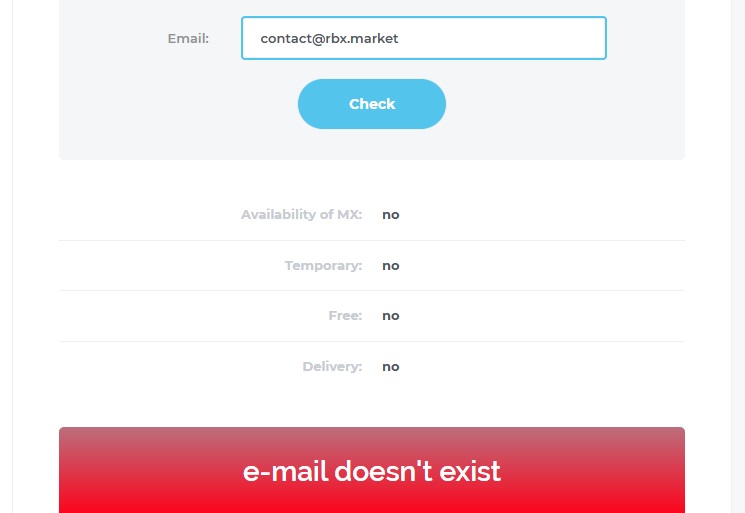 Из контактов указана только электронная почта, причем на сайте она в шаблонном формате — contact@rbx market (contact@ mysite com), а в пользовательском соглашении — info@rbx market, обе не существуют. Аккаунт в Телеграмм (ТГК) для связи с саппортом не предусмотрен