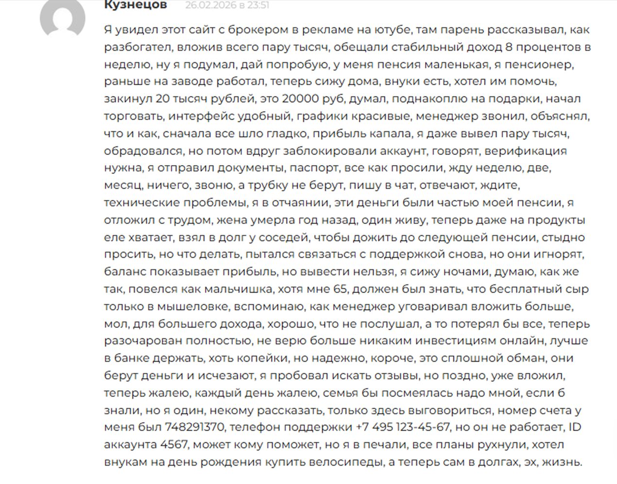 При попытке перехода на сайт оказывается, что он заблокирован и более недоступен. Вероятнее всего, перед нами очередная биржа-однодневка, которая в действительности не предоставляла никакого доступа к рынкам и просто занималась выманиванием денег у пользователей.