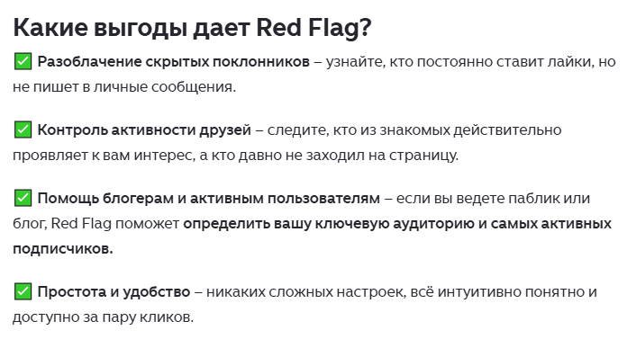 Посмотреть чужие переписки, как обещают в некоторых ТГК, Ред Флаг не может. Узнать, кто заходил на страницу, тоже. Когда бот показывает заходы и активность, он просто делает предположение. Из тех пользователей, кто когда-то ставил лайки или оставлял комментарии, он составляет список.