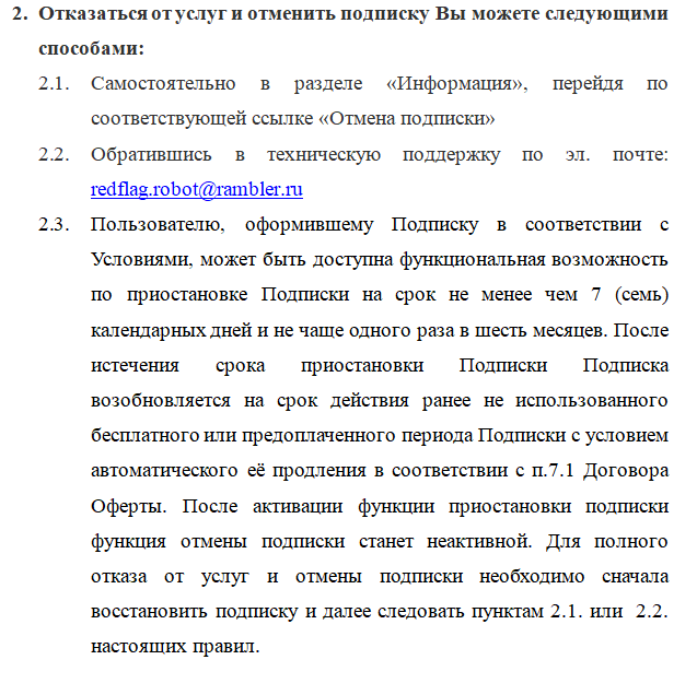 Отписаться через бот Red Flag в Телеграм невозможно. Такая кнопка просто не работает. В пользовательском соглашении прямо написано, что подписка не останавливается.