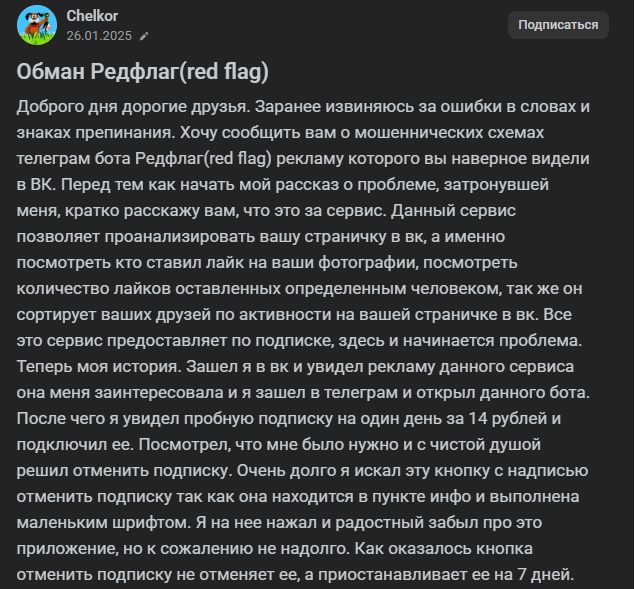 Редфлаг в Телеграм очень похож на лохотроны с подпиской на «подборку кредитов в МФО». Когда человек приходит, оплачивает пробный период на 2 суток, а через месяц с него начинают списываться по 1 000 рублей «за консультации».