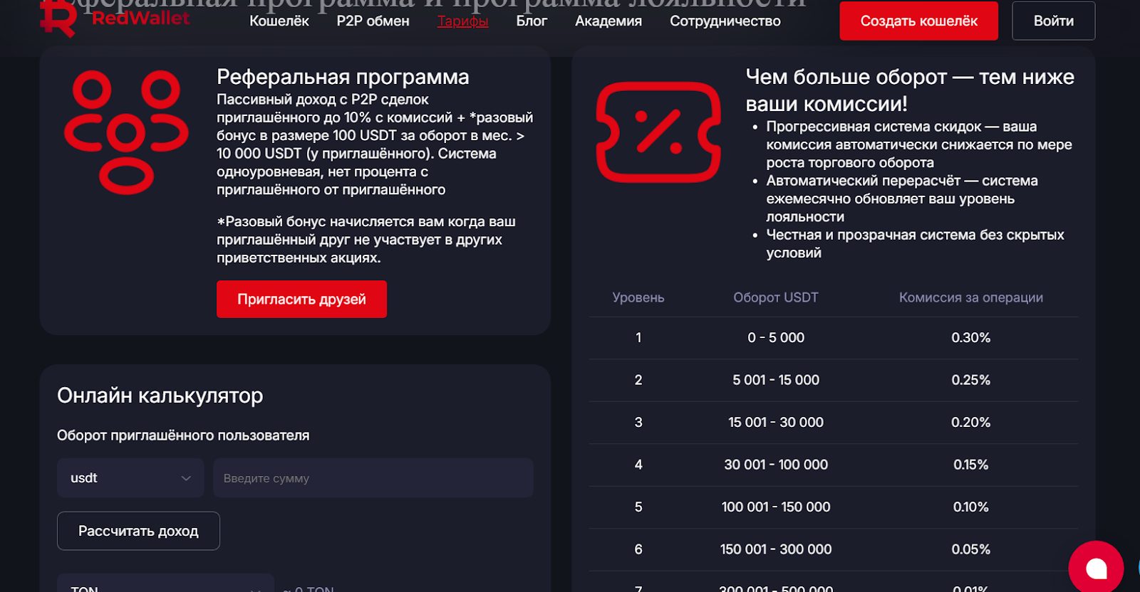 Редваллет предлагает участвовать в реферальной системе, за пассивный заработок друзей обещают до 10% с комиссий. Бонус составляет 100 USDT, если оборот будет свыше 10 тыс. Когда можно будет вывести деньги за партнерскую программу, не обозначено.