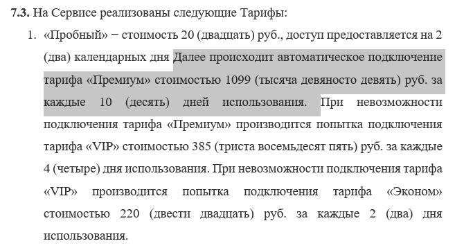 Во-вторых, здесь есть пункт об автоматическом продлении пробного периода, причем по самому дорогому тарифу – за 1099 рублей, которые потом будут списывать каждые 10 дней. Конечно, в самом приложении нет речи об автопродлении, а подобные документы почти никто не читает.