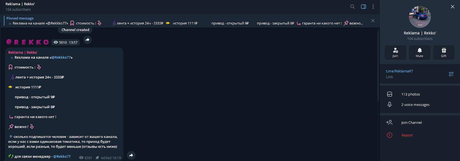 «Рекко» — тг-канал, который предоставляет услуги размещения рекламы и ранее предлагал услуги по раскрутке счета. В обзоре мы разберемся, какой контент публикуется на паблике и на чем зарабатывает его владелец. Выясним, чем он привлекает внимание пользователей, насколько активна аудитория и какие нюансы стоит принять во внимание перед сотрудничеством.
