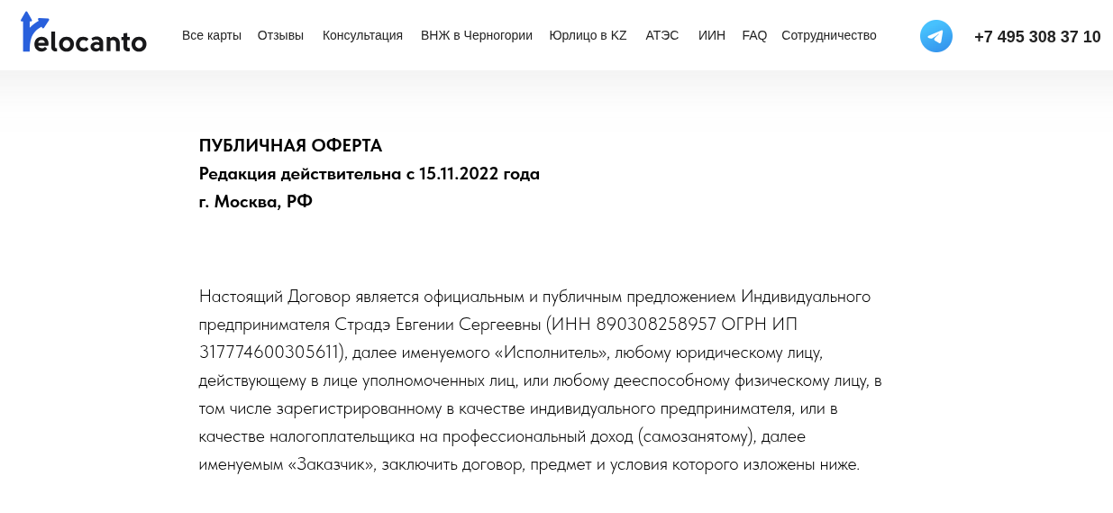 Формально сайт Relocanto Ru опирается на реально существующее юридическое лицо. В политике конфиденциальности и публичной оферте указана ИП Страдэ Евгения Сергеевна (ИНН 890308258957) с регистрацией в статусе предпринимателя от 2017 года. Наличие верифицированного бизнеса однозначно лучше полной анонимности, однако условия обслуживания составлены исключительно в интересах провайдера «Релоканто».