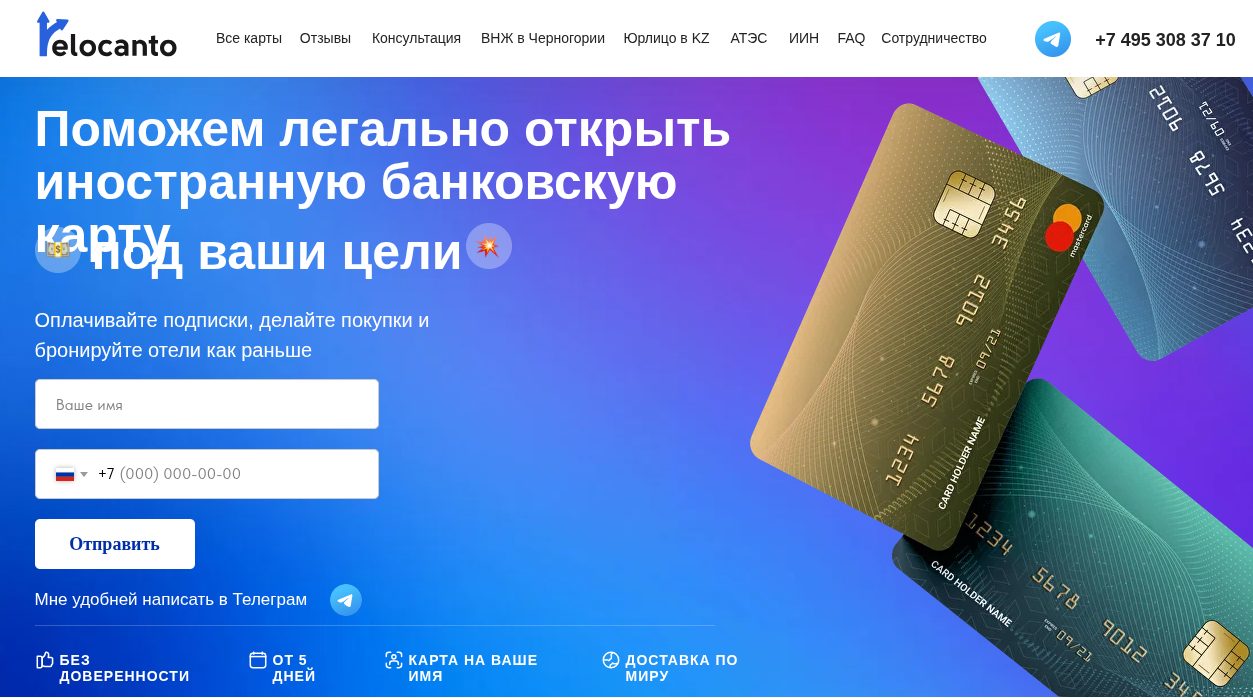 «Релоканто» — посреднический сервис для удаленного оформления банковских карт иностранных государств гражданам РФ. Разработчики проекта уверяют, что работают строго по договору, выдают чеки и напрямую сотрудничают с разными банками.