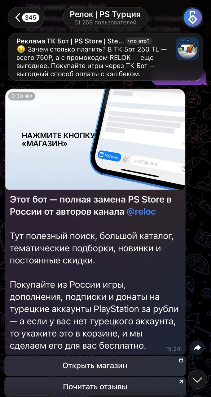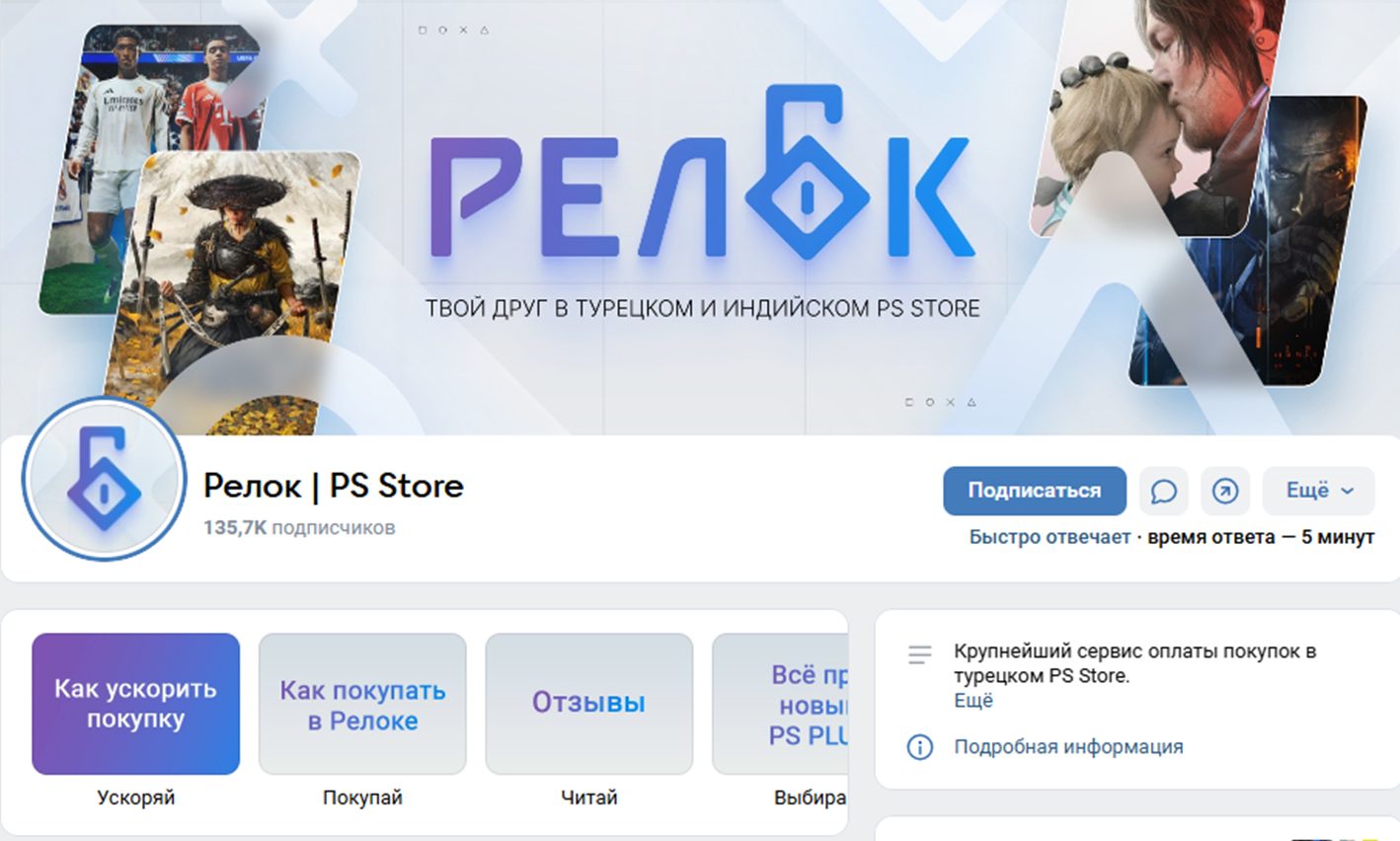 Проект «Релок ps Турция» в тг работает с 2023 года, он назван альтернативой PS Store, который ушел из России. Его владельцы предлагают услуги по оплате известных игр и подписок, за счет создания турецкого платежного аккаунта.