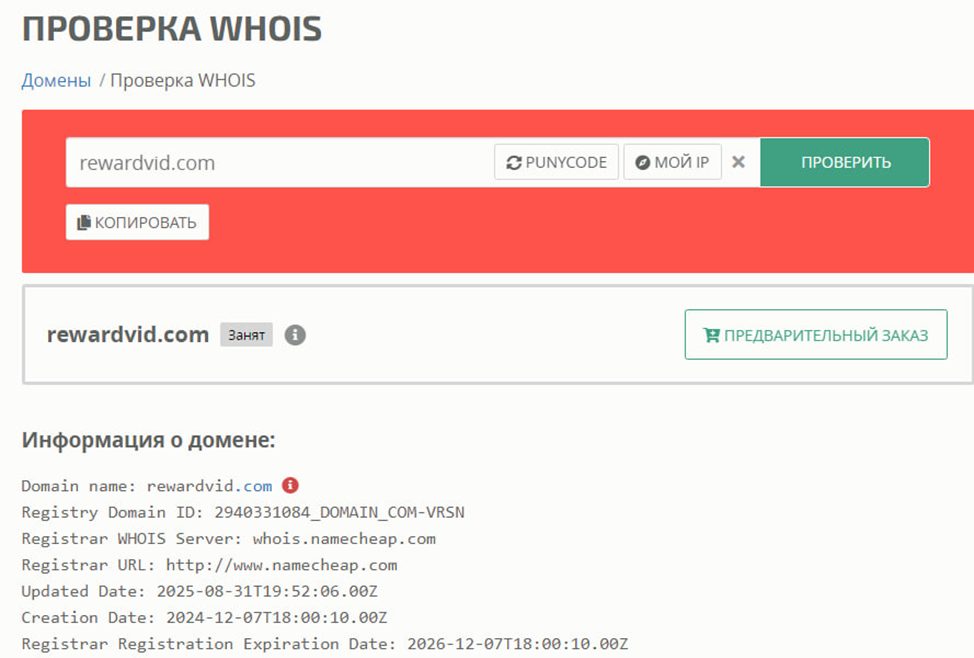 На сайте не указано, когда был создан проект. Домен Rewardvid Com зарегистрирован в декабре 2024 года. Но обозреваемая платформа взяла управление над ним в августе 2025 года. Площадка создана 5 месяцев назад. Она совсем свежая и до конца не проверена. Оставлять на ней свои данные или пытаться заработать может быть опасно. Отсутствие прозрачности в истории развития и ранний этап существования платформы вызывают закономерные вопросы о ее надежности и долгосрочных перспективах.