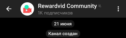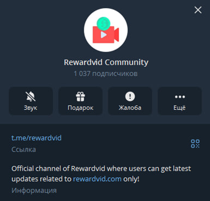 У сервиса имеется телеграм-канал: Rewardvid Community. Он не зарегистрирован на TGStat, поэтому отследить точную статистику тяжело. Канал создан 21 июня 2025 года. За это время на него подписалась 1 тысяча подписчиков. Для чего создан блог, непонятно, так как опубликовано только два поста. В первом говорится, что это лучшая платформа для заработка на просмотре видео и ускорения роста на Ютубе. Во втором указан бот в качестве службы поддержки. На этих публикациях около 2 тысяч просмотров. Скорее всего, владельцы покупали рекламу и эти посты пересылали в другие каналы для ознакомления.