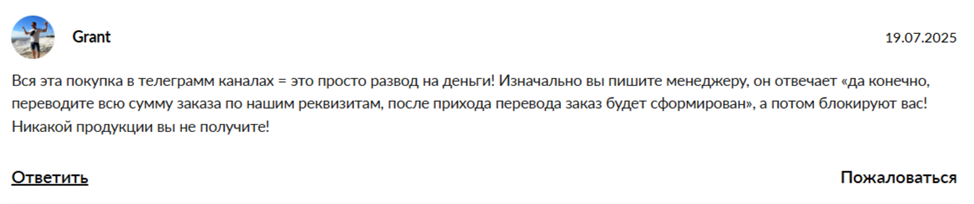 После тщательной проверки телеграм-канала «Рыбное Место» с морепродуктами РФ мы узнали, что его администрация использует классическую мошенническую схему. В сообществе обманывают пользователей, требуя полную предоплату за товары. Якобы так обеспечивается страховка продукции от возврата. Мы нашли несколько минусов: